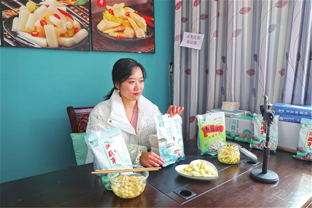 湖北海马食品有限公司主播“沔阳小慧”直播推介仙桃泡藕带。
