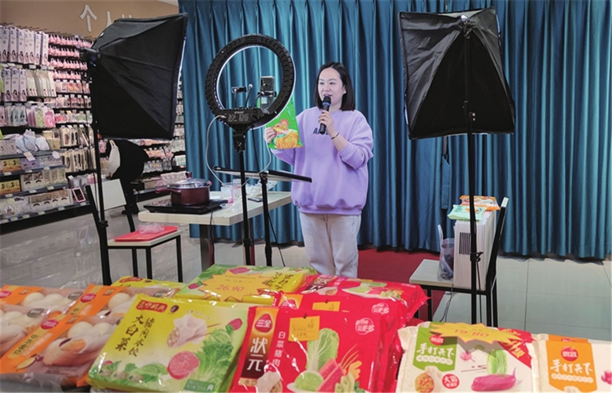 富迪三友生活广场超市内,女主播与粉丝互动。