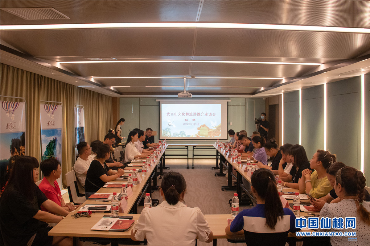 推介会上,参会人员集中观看了武当山首创的穿越版文化旅游宣传片《武当逍遥游》。生动的视角集中展现了武当山绚丽多姿的自然风光、气势恢宏的古建筑群、碧波万顷的太极圣水、玄妙飘灵的武当武术和大气恢宏的武当文化。武当山特区灵秀国际旅行社代表重点推介了武当山康养、红色、研学旅游等全域旅游线路。