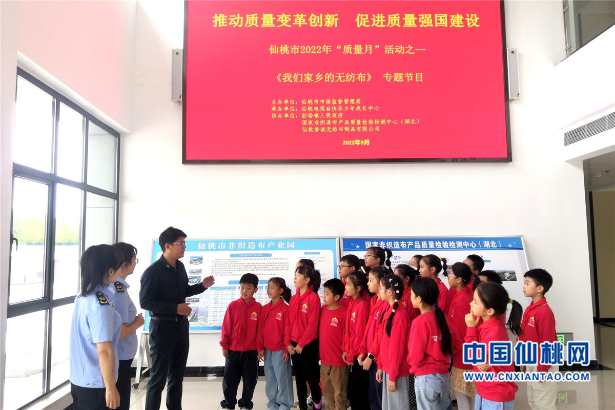 9月24日,市市场监督管理局在国家非织造布产品质量检验检测中心开展以“推动质量变革创新,促进质量强国建设”为主题的质量月宣教活动,邀请了仙桃电视台快乐少年成长中心26名小主持人参加本次活动。图为产品质量检验检测中心工作人员为小主持人们作现场讲解。(仙桃网记者 胡肖文)