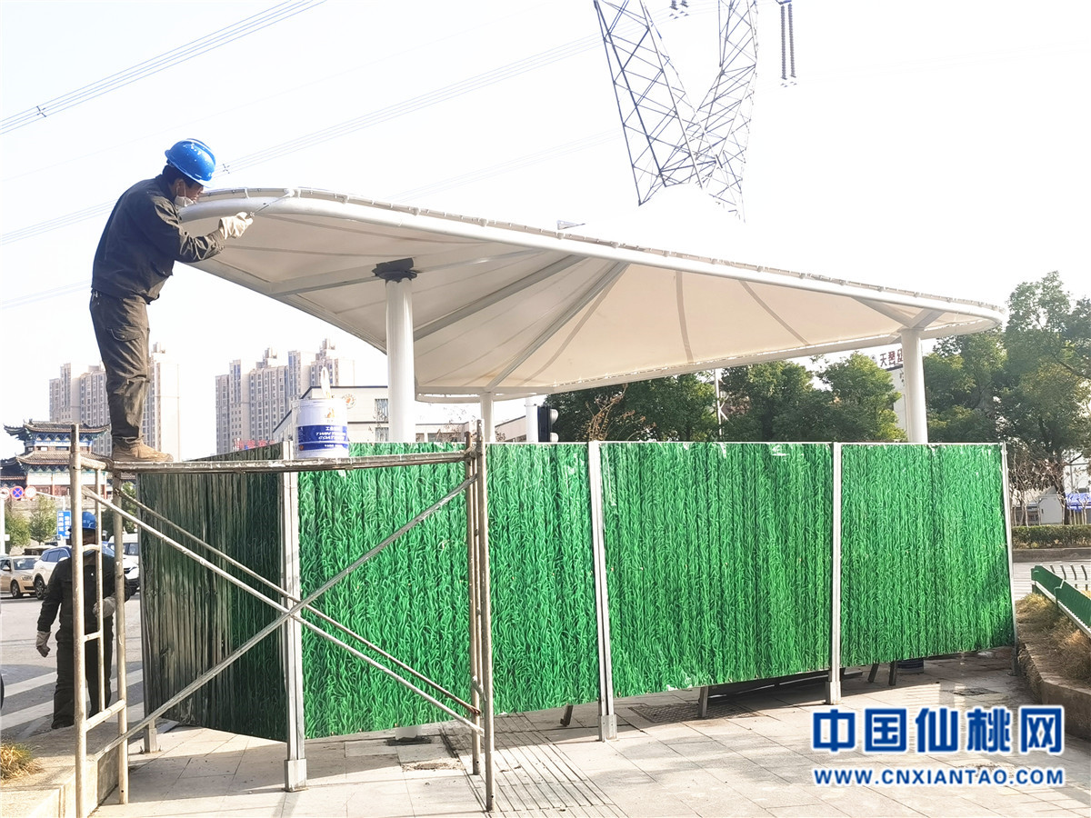 11月20日,在宏达路和江汉路交汇处的十字路口,几名安装工人正紧张有序地进行渠化岛遮阳棚建设。新型遮阳棚外形呈不规则三角型,既大方又实用,成了市民出行遮阳避雨的港湾,目前各主要路口正逐步推广。(仙桃网记者 黄芸)