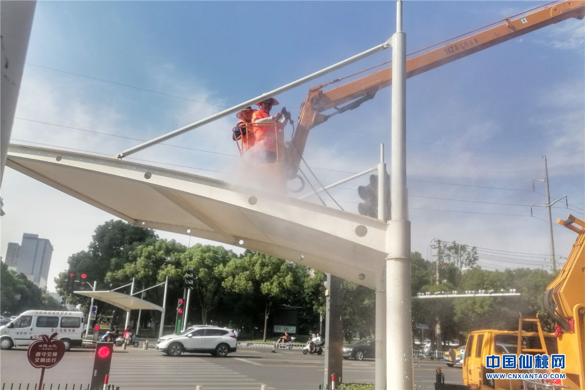6月9月下午,仙桃大道与汉江路交岔路口,市环卫局环卫工人正使用高压冲洗车对遮阳棚进行冲刷作业。