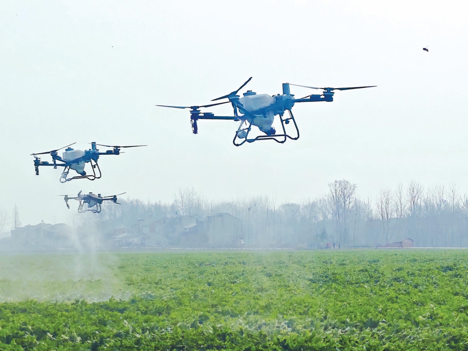 眼下油菜正值蕾苔期,全市各地抢抓农时,加强田间管理。图为3月6日,三伏潭镇万亩油菜示范区,无人机正在飞防作业。(摄影 记者 黄芸)
