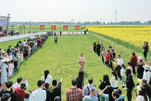 在趣味抓鸡环节,游客们跃跃欲试,参与者手忙脚乱地追逐四处奔逃的鸡群,鸡飞人跳,场面欢乐。“欢乐运柚”趣味游戏中,大家沉浸式在赛道上运输柚子,一侧的围观人群捧腹大笑。此外,簪花体验、拔河比赛、围炉煮茶等,给足了大家情绪价值。