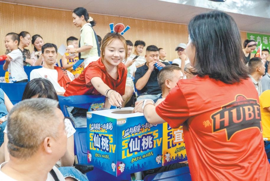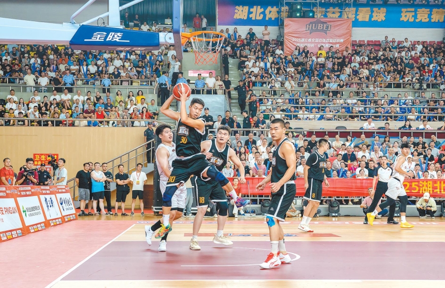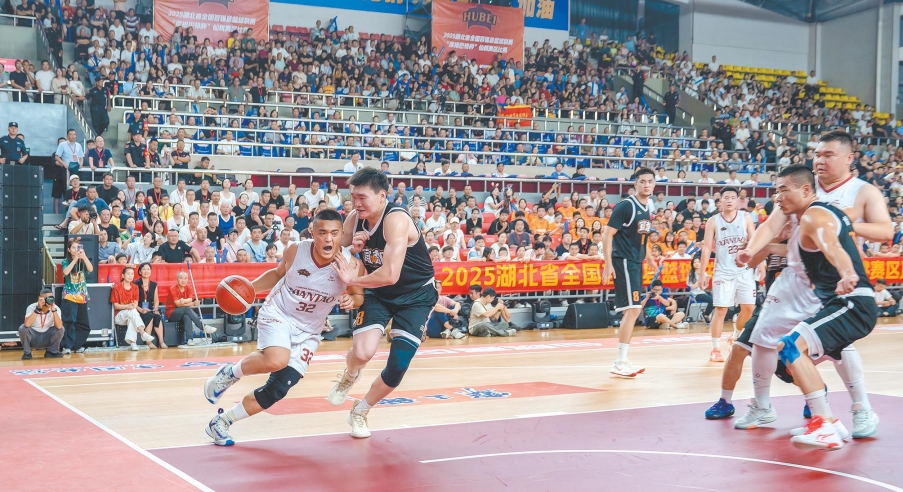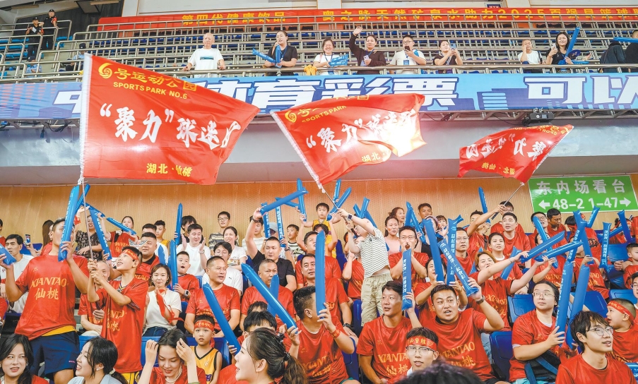 运球、传球、突破、投篮、防守……比赛进入胶着状态,双方你追我赶,精彩场面接连上演。二楼看台上,来自市交通运输局的威风锣鼓“加油团”跟随比赛进程有节奏地敲锣打鼓,呐喊助威,将比赛氛围不断推向高潮。观众们挥舞旗帜,为仙桃队加油,为宜都队喝彩,展现出“有朋自远方来,不亦乐乎”的至诚热情。