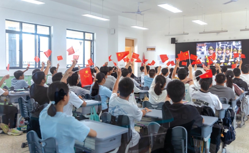仙桃中学组织全校师生集中收看九三阅兵现场直播,将一堂生动的爱国主义教育课搬进校园。摄影记者郑恒