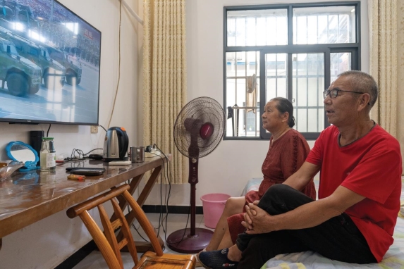 胡场镇建堤村村民在家收看九三阅兵直播。摄影记者陈亚东