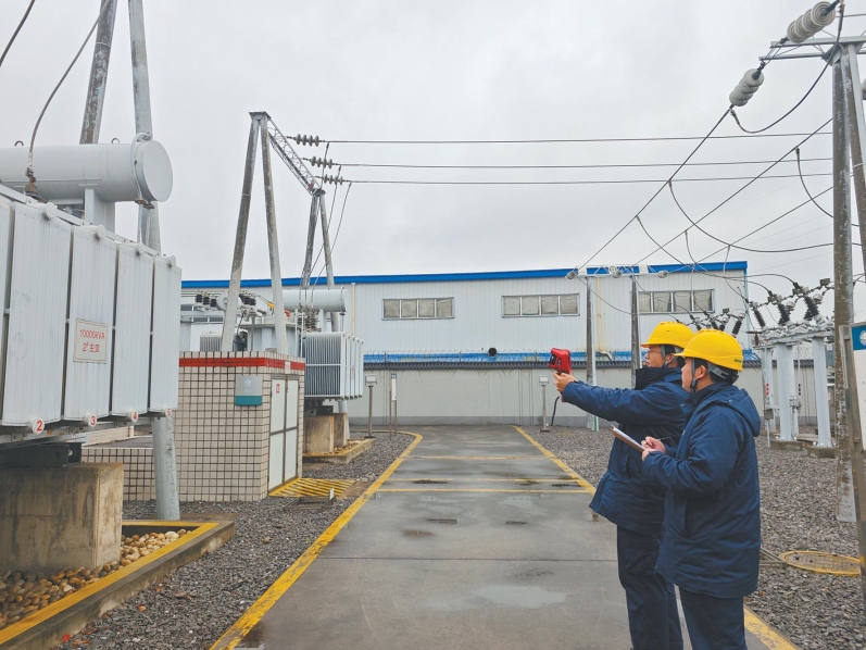 1月19日,国网仙桃市供电公司迅速启动应急预案,组织巡检人员对重点线路展开特殊巡视。工作人员利用红外测温仪、无人机等设备,逐段检查线路覆冰及杆塔基础状况,确保电网在极端天气下安全稳定运行,保障沿线用户可靠用电。图为工作人员在新里仁口变电站检查设备运行情况。摄影记者 晓旦 通讯员 范典