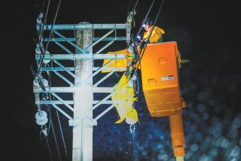 20日凌晨,国网仙桃市供电公司电力工人在郭河镇抢修。摄影记者晓旦通讯员范典