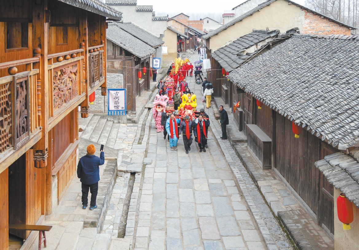 春节的脚步越来越近,乡村升腾起浓浓的年味。郑场镇渔泛古村沿街挂起了大红灯笼,上演舞龙舞狮热闹场面,处处洋溢着喜庆氛围。