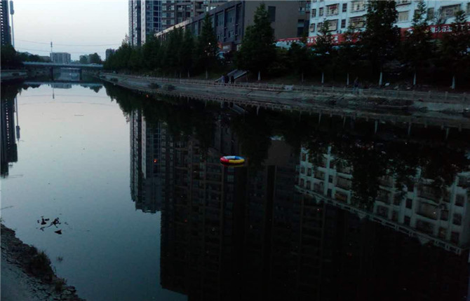 胡泽兵说,游泳圈被扔到河里的第二天早上6点,他就来这里查看,本来想打捞河里的游泳圈,没看见水上有游泳圈,反而发现这个路段少了2个救生杆和4个救生圈。