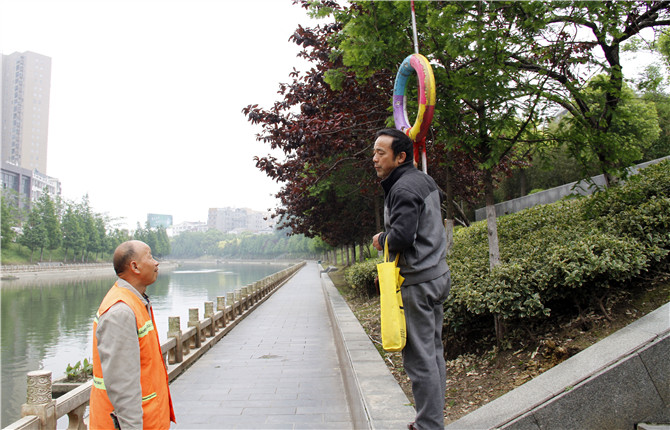 “插到别人搞不动,就失去了它及时救人的意义了。这杆子插的深浅,我们都做过研究。深了,怕别人不能及时拔起来,浅了,容易倒。”胡泽兵细心地为环卫工讲解,刚开始救生设施是插在河上的花坛上,但是涨水的时候,救生圈就会被冲走,又担心别人要翻过栏杆拿救生设施不安全,所以后来全部移到树这里了。