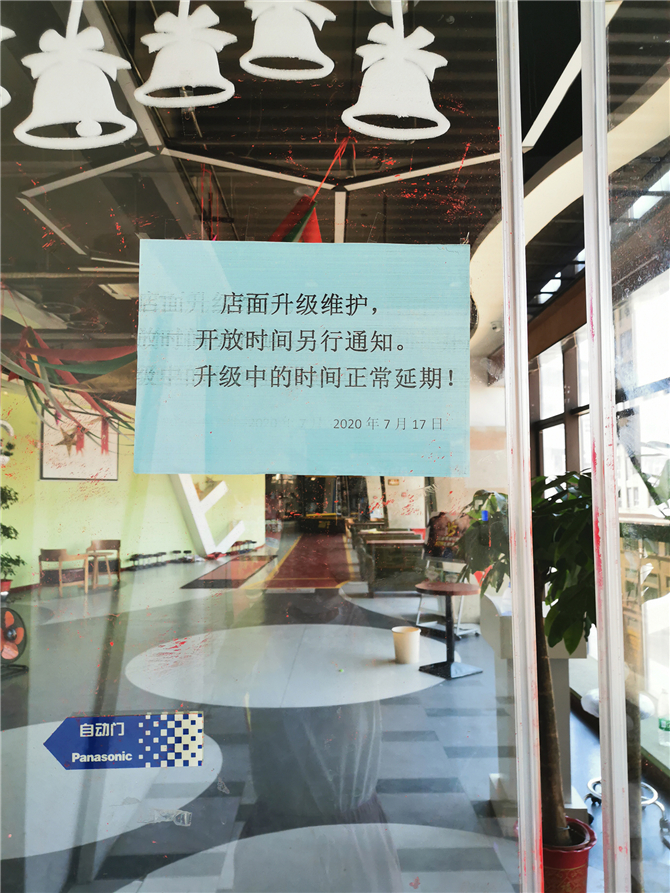 8月16日,记者来到位于元泰商业步行街4楼的博力可,发现大门紧闭,空无一人。门上写着“店面升级维护,开放时间另行通知。升级中的时间正常延期!”落款时间为7月17日。