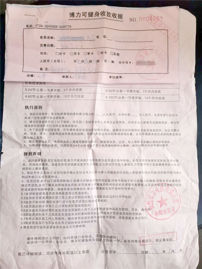 “我是7月初办的博力可健身私教卡,每小时220元,总课时费5280元。没想到居然这么快就关了门,总不能说一收了钱就跑路吧!”会员代先生气愤地说道。