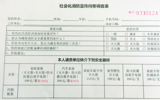 事实上,记者在2019年就接到过类似投诉,网友“写一首浪漫的歌”介绍,“一个做消防培训的来我们公司了,好多人都买了他们(的产品)”,并配上了这家名为“政安消防”的工作人员在公司宣讲以及填写收款收据的照片。在该网友拍摄的产品价目表上,一套“灭火器+灭火毯+防火防震自救手电筒”的套装为499元,一套“灭火器+防火自救手电筒”的汽车套餐为368元,而类似的产品在淘宝上定价都分别不到100元,相当于比市面价格贵出了4倍。