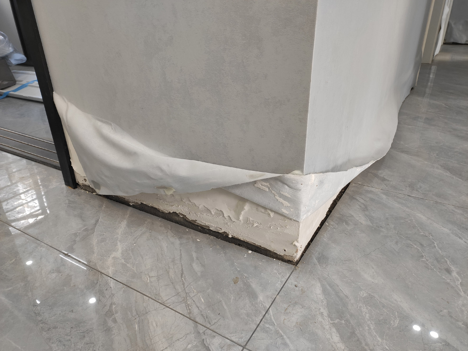 2022年12月30日,记者来到罗先生家实地探访。经此遭遇,罗先生的新房“旧”了不少。污水虽已被清理,但黄色污渍仍留有明显印记:踢脚线被泡涨变形,部分脱落;卧室门框开裂,开合受到影响;衣柜底部变形,边缘翘起;下部墙面被泡后,墙布脱落、墙体浸泡明显,墙面黄色渗透痕迹最高处超过30厘米。此外,卫生死角、墙角等处还残留有一些未清理干净的污物。