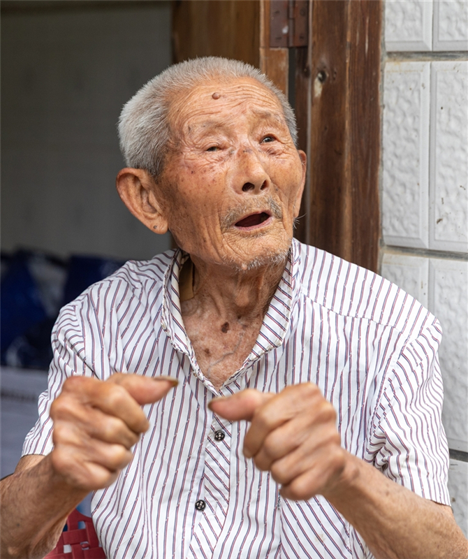 93岁的胡大九,谈到自己当兵的经历,顿时眼泪夺眶而出。他幼时父母双亡,家庭贫困,由于在当地年轻人中表现好,被选中成为了一名新四军战士。