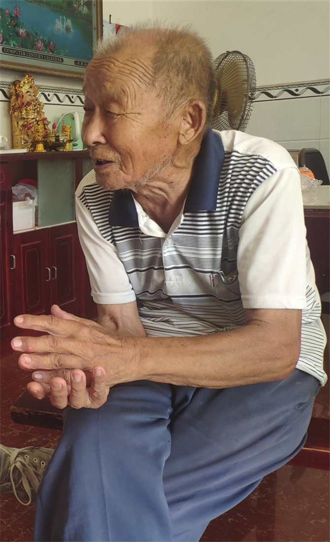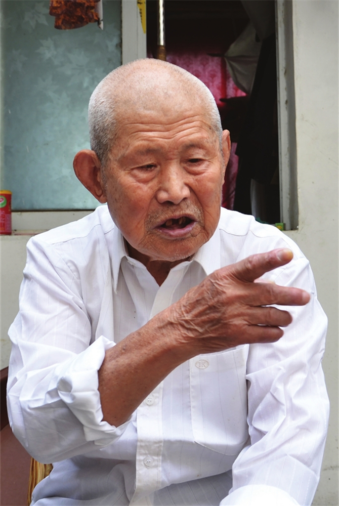 7月23日,走进张卿乡老人家中,94岁的他安详地坐在摇椅上看电视新闻,听到记者来采访,他激动地指着左臂和左腿上的伤疤,那是抗日战争留下的“印记”。
