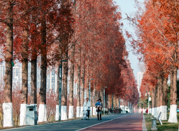 12月24日,市民在前通路水杉步道上游玩。摄影 记者 郑恒
