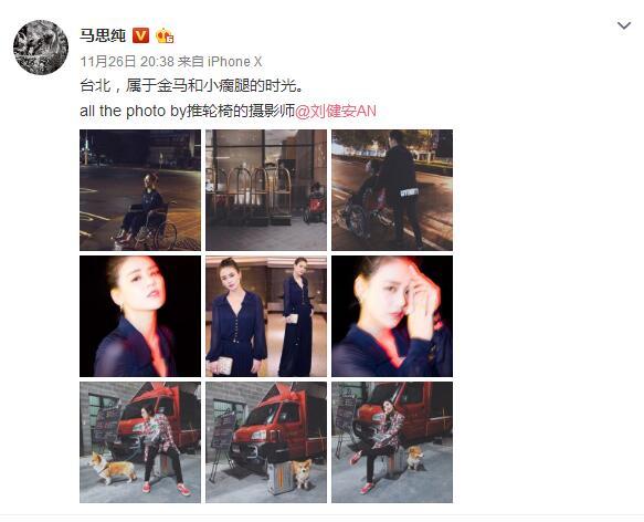 凤凰网娱乐讯 上届金马奖最佳女主角得主马思纯此次因脚伤而未走红毯,在红毯尽头等待周冬雨,并以颁奖嘉宾的身份为最佳男主角颁奖。11月26日晚,马思纯通过微博晒在台北街头的照片,并写道:“台北,属于金马和小瘸腿的时光。all the photo by推轮椅的摄影师@刘健安”。
