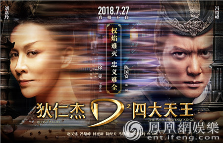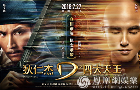 电影《狄仁杰之四大天王》由华谊兄弟电影有限公司、工夫影业出品,天津猫眼微影文化传媒有限公司、上海淘票票影视文化有限公司、万达影视传媒有限公司、优酷电影有限公司、咪咕文化科技有限公司联合出品。徐克执导,陈国富监制,赵又廷、冯绍峰、林更新、阮经天、马思纯主演,并有刘嘉玲饰演武则天,影片将于7月27日全国公映。