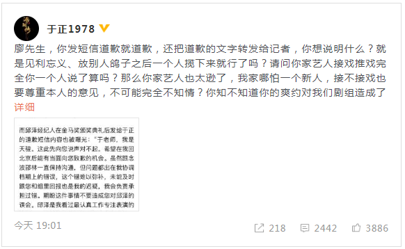 11月18日晚,于正在微博贴出邱泽经纪人的道歉信,并称:“廖先生,你发短信道歉就道歉,还把道歉的文字转发给记者,你想说明什么?就是见利忘义、放别人鸽子之后一个人揽下来就行了吗?请问你家艺人接戏推戏完全你一个人说了算吗?那么你家艺人也太逊了,我家哪怕一个新人,接不接戏也要尊重本人的意见,不可能完全不知情?你知不知道你的爽约对我们剧组造成了多大的伤害?”